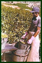 Nächster Schritt: die Trauben werden in eine Lösung aus Pottasche getunkt. Die soll die Farbe bewahren und beim Trocknen helfen, denn diese Trauben werden Rosinen, die hellen, großen, die später mit Lorbeerblättern und Mandeln gemischt werden. | ![]() |