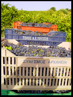 Die getrocknete Trauben kommen zum Reinigen und Verpacken in die Genossenschaft, eine der ersten und größten Kretas. Ganz in der Nähe die andere Variante des Weinanbaus: 'Krevatínes', von